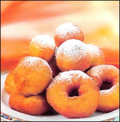 Тыкву очистить от кожицы и семян, нарезать и сварить в небольшом количестве воды, затем протереть через сито. Из муки, сахара, дрожжей , масла и протёртой тыквы замесить тесто, оставить его на 2 часа для брожения. Из готового теста сформировать пончики и жарить во фритюре. Готовые пончики посыпать сахарной пудрой.