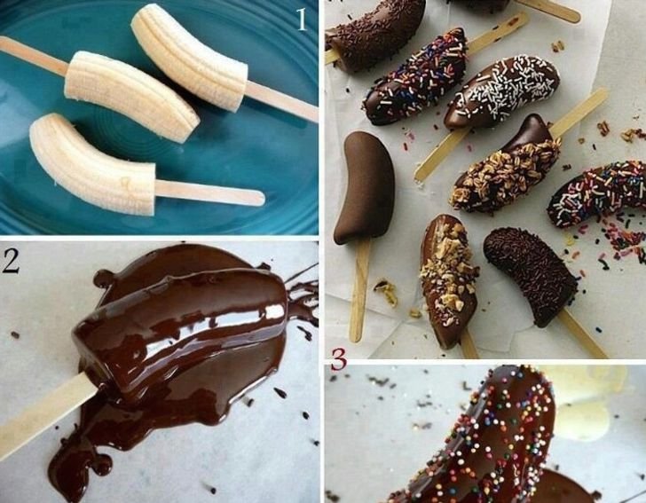 4 крупных банана,12 деревянных палочек для мороженого, 1 стакан натёртой шоколадной плитки, 2 столовые ложки рафинированного растительного масла, кокосовая стружка или измельчённые орехи.