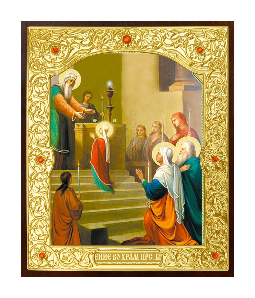 Когда Деве Марие исполнилось три года, святые родители решили исполнить своё обещание. Собрав родственников и знакомых, одев Пречистую Марию в лучшие одежды, с пением священных песен, с заженными свечами в руках привели Её в Иерусалимский храм. Там встретил отроковицу первосвященник со множеством священников. В храм вела лестница в пятнадцать высоких ступеней. Младенец Мария казалось, не могла бы Сама взойти по этой лестнице. Но, как только Её поставили на первую ступень, укрепляемая Силой Божией, Она быстро преодолела остальные ступени и взошла на верхнюю. Затем первосвященник по внушению Свыше, ввёл Пресвятую Деву в Святое Святых, куда из всех людей только раз в году входил первосвященник с очистительной жертвенной кровью. Все присутствующие в храме дивились необыкновенному событию. Праведные Иаким и Анна, вручив Дитя воле Отца Небесного, возвратились домой. Преблагословеная Мария осталась в помещении для девственниц, находившимся при храме.