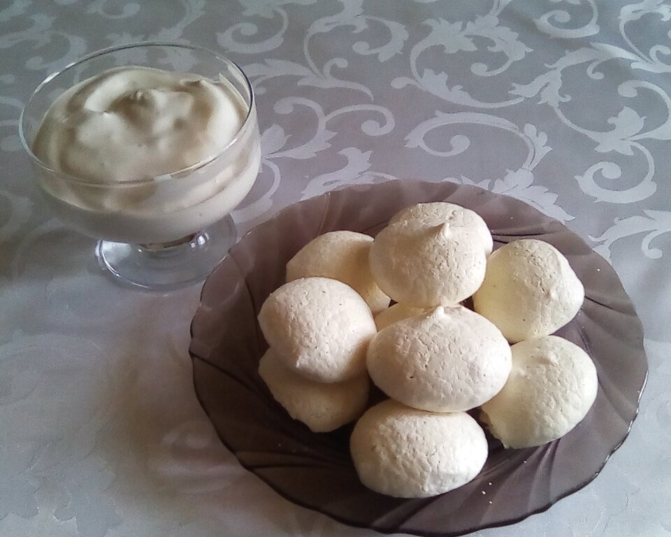 Разогреть духовку до 100-110 градусов. Противень для выпекания застелить пергаментной бумагой. Сделать безе из кондитерского мешка. Безе сушить в духовке 1,5 часа. Если безе твёрдое и хорошо снимается значит готово. Отключить духовку и оставить до полного остывания.