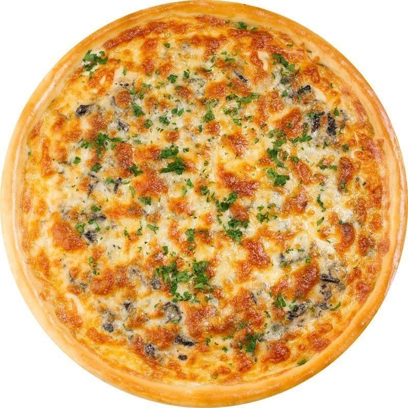 Тесто раскатать в тонкий пласт, сверху равномерно распределить остывшую начинку. Посыпать натёртым сыром. Выпекать пиццу в разогретой до 190 градусов духовке 15-20 минут.