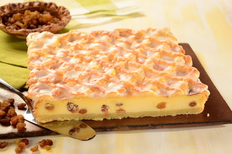 Выложить творожную начинку на корж и разровнять. Оставшееся тесто раскатать в пласт, нарезать на полосы и выложить их поверх массы в шахматном порядке.