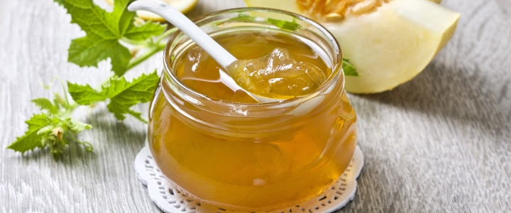 600 г дыни, 1 стакан сахара, 400 мл воды, 2 столовые ложки лимонного сока.