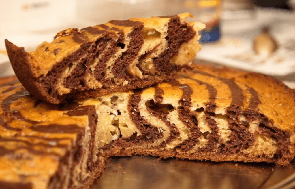 В центр формы выложить 1 столовую ложку светлого теста, затем в центр светлого теста выложить 1 столовую ложку шоколадного теста. Так чередовать пока тесто не закончится.
