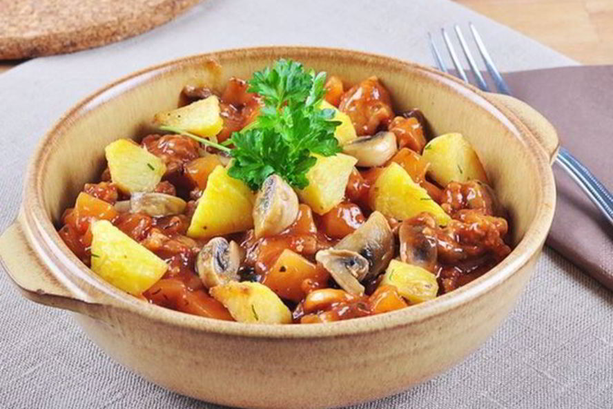 500 г мясного фарша, 8-10 (некрупных) картофелин, 1 средний кабачок, 1 луковица, 1 морковь, 200 г шампиньонов, 3 зубчика чеснока, 0,5- 1 острый перец, растительное масло для жарки, соль по вкусу, зелень для подачи.