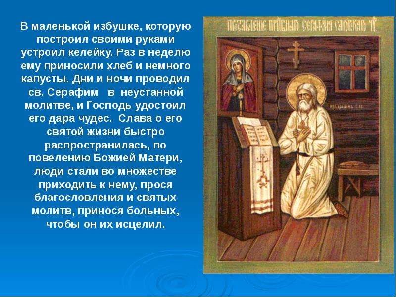 С именем Серафима Саровского много чудес связано и после его кончины — известны случаи, когда люди прозревали, обретали слух и голос, излечивались от хромоты и других болезней, помолившись и умывшись из Святого источника преподобного в Саровской обители.