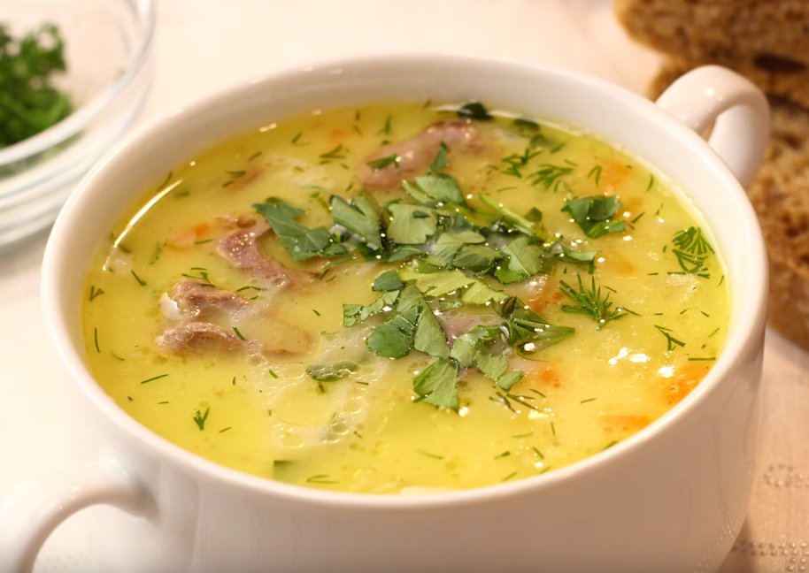 500 г куриной грудки, 3 литра воды, 1 чайная ложка соли, 2-3 лавровых листа, 400 г картофеля, 150 г лука, 180 г моркови, 300 г плавленого сыра, зелень.