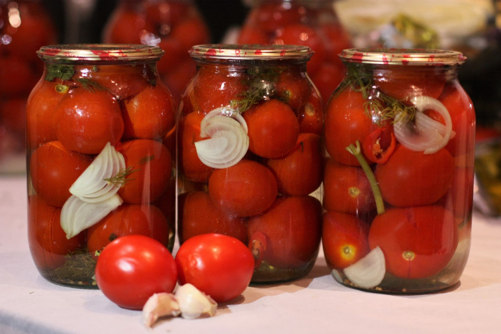 Помидоры хорошо помыть. Банки промыть и обдать немного уксусом, чтобы не стерилизовать.