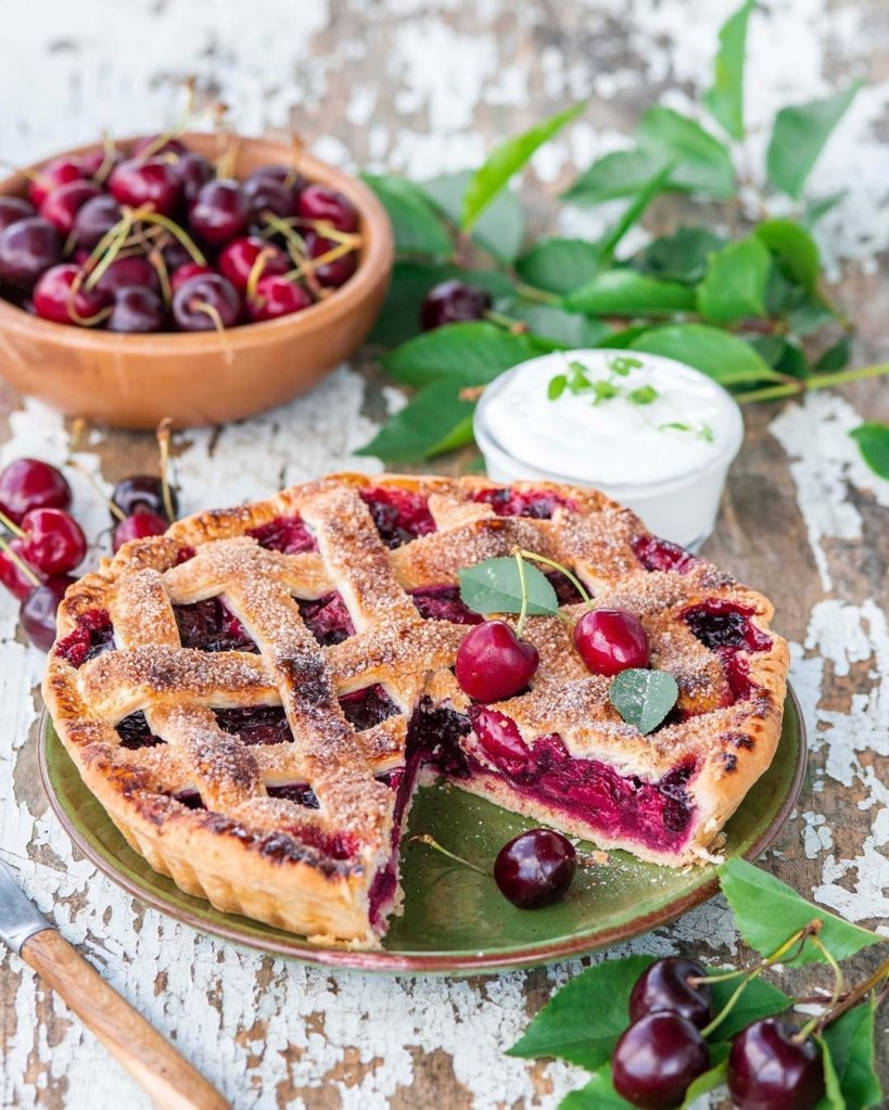 Сделать пирог с вишнёвой начинкой. Выпекать в духовке 35-40 минут, при температуре 180 градусов.