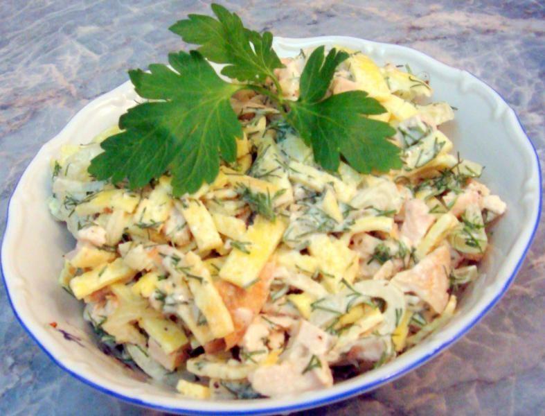 200 г куриной грудки, 1 огурец, 1 красный болгарский перец, 2 яйца, 3 столовые ложки сметаны, 2 чайные ложки горчицы, соль, перец, куркума по вкусу.