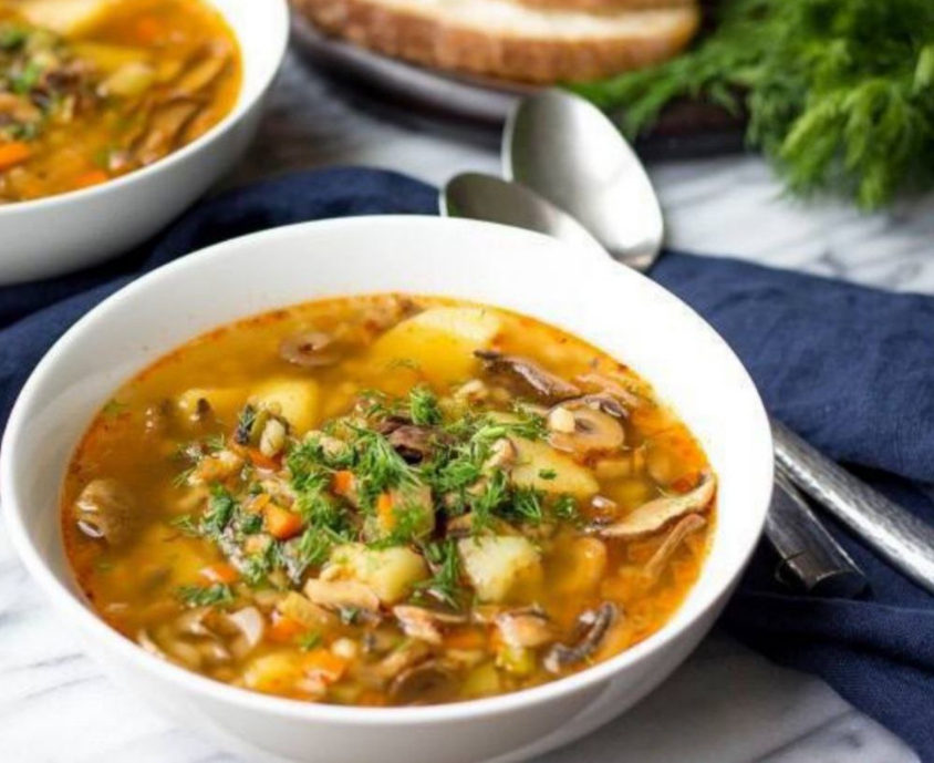 50 г сухих грибов, 1 луковица, 1 морковь, 2 картофелины, 2 столовые ложки перловки или риса, 2 солёных огурца, два лавровых листа, соль, перец по вкусу, зелень.
