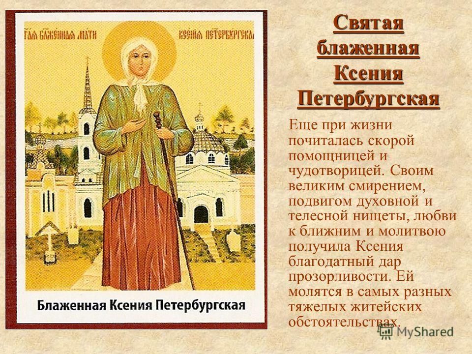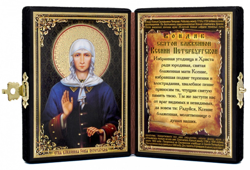 6 февраля день памяти святой блаженной Ксении Петербургской. Святая Ксения добровольно приняла крест юродства ради спасения любимого мужа, который умер без покаяния. С особым трепетом почитают святую блаженную Ксению Петербургскую, которая является примером подлинной супружеской любви. За её подвиг юродства Господь ещё при жизни наградил Ксению даром прозорливости, а по молитвам к святой Ксении и по сей день происходят чудеса. Святой Ксении Петербургской молятся о помощи в создании семьи, о зачатии и рождении здорового ребенка, об укреплении веры и силы духа, она покровительствует молодожёнам и помогает при беременности и родах. Святая Ксения Петербургская помогает молящимся спастись от недобрых людей и усмирить в них гнев и злобу, святой молятся об исцелении, о помощи в решении финансовых и жилищных вопросов, святая Ксения помогает в самых разных житейских нуждах.