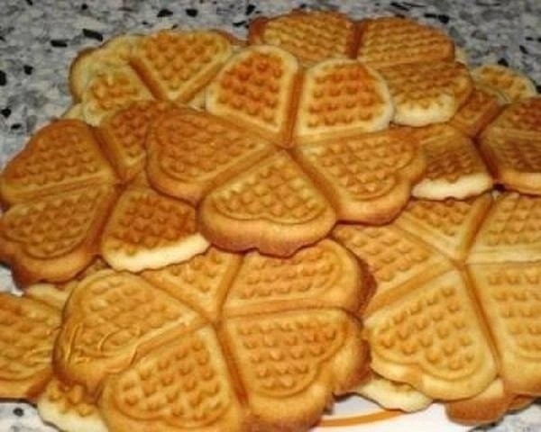 Взбить тесто миксером: сначала яйца и сахар, а потом всё остальное, муку и разрыхлитель в последнюю очередь. Выпекать в форме для печений. Такое тесто подойдет и для электрической формы.
