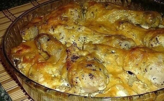 6 куриных ножек, 1кг картофеля, 250г сметаны, соль, перец, сушёные травы по вкусу, 2 зубчика чеснока, 300г сыра.