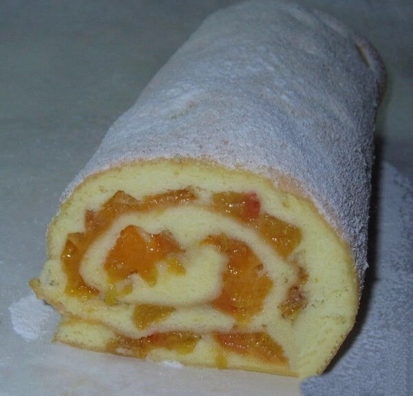 Затем добавить к взбитым желткам муку с разрыхлителем, ванильный сахар, растительное масло и всё тщательно взбить.Затем, аккуратно перемешивая, ввести в полученную массу взбитые с сахаром белки. Тесто получится жидким, но пышным.Включить духовку на 180-200 градусов.Для начинки рулета нарезать абрикосы тонкими пластинками .Уложить фрукты на силиконовый коврик или бумагу для выпечки на противне, посыпать корицей. Залить абрикосы тестом и поставить противень в разогретую духовку на 15 минут( время зависит от свойств духовки и нужно следить за процессом). Готовый корж с фруктами перевернуть на силиконовый коврик посыпанный сахарной пудрой и аккуратно снять пергамент в теплом виде аккуратно закатать в рулет.Остывший рулет по желанию можно посыпать сахарной пудрой или украсить по желанию.