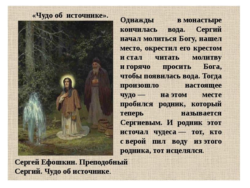 И под тем же дубом стал старец на молитву. Окончив, незнакомец вынул из-за пазухи ковчежец, взял частицу просфоры, благословил ею Варфоломея и велел съесть. -Это даётся тебе знак благодати и разумения. Отныне овладеешь грамотою лучше братьев и товарищей. Варфоломей пригласил старца домой. Старец позвал мальчика и велел читать псалмы. Мальчик говорил, что не умеет, но старец сам дал книгу. Тогда Варфоломей начал читать, все были поражены, как он хорошо читает. После смерти родителей Варфоломей отправился в Хотьково- Покровский монастырь, где уже иночествовал его овдовевший брат Стефан. Стремясь к строжайшему монашеству он оставался здесь не долго и вместе со Стефаном основал пустынь на берегу реки Контуры на холме Маковец посреди глухого Радонежского бора где и построили небольшую деревянную церковь во имя Святой Троицы (1335 г) на месте которой теперь стоит соборный храм во имя Святой Троицы. Не выдержав сурового образа жизни, Стефан вскоре уехал в Московский Богоявленский монастырь, где стал игуменом. Варфоломей остался в одиночестве, он призвал игумена Митрофана и принял от него постриг под именем Сергий. Преподобный Сергий просил благословения у игумена Митрофана на пустынную жизнь. Молодой монах жил один среди сумрачных лесов. Возникали пред ним образы зверей и мерзких гадов. Бросались на него со свистом, скрежетом зубов. Однажды ночью через стену вошёл сам сатана, с ним целый полк бесов. Они грозили прогнать преподобного, наступали. Преподобный молился- Да Воскреснет Бог и расточатся врази Его- и всё исчезло. Господь хранил преподобного Сергия. Один раз у келии Сергий увидел огромного медведя слабого от голода, он пожалел его. Принёс из келии краюшку хлеба. Мохнатый мирно съел и стал навещать преподобного. Сергий всегда кормил его краюшкой хлеба и медведь сделался ручным. И вот стал приходить люд, прося взять к себе спасаться. Построили 12 келий, обнесли тыном для защиты от зверей. Между огромными соснами братия обрабатывала свой скромный огород. Жили тихо и сурово. Сергий Радонежский был примером во всём. Сам строил келии, таскал брёвна, носил воду, делал всё, что было нужно для жизни в лесу. Шли годы община стала больше, сформировался монастырь. Сергий стал игуменом и примером, братия очень любила его. Стало расти число братии, монастырь расширился. Обитель жила бедно. Но Господь помогал братии, братия много трудилась. Дмитрий Донской приехал в Лавру с воеводами. Сергий Радонежский благословил Дмитрия Донского на Куликову битву. Сергий Радонежский шепнул на ухо: Ты победишь.