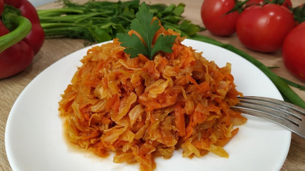 2 куриных грудки, 1 средняя головка капусты, 1 большая луковица, 2-3 зубчика чеснока, 2 столовые ложки оливкового масла, 1 столовая ложка томатной пасты, 1 стакан куриного бульона, Соль и перец по вкусу.