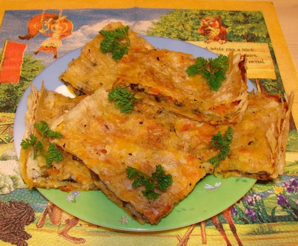 Дно формы смазать растительным маслом. На дно положить лаваш, на него слой овощей, снова лаваш, затем жареные с луком грибы, снова лаваш и на него выложить овощи, верхний слой из лаваша. Верхний слой смазать оливковым маслом со специями и поставить в духовку при температуре 180-200 градусов на 30 минут. Остужать лучше в духовке — лазанья будет более пропитанной и сочной!