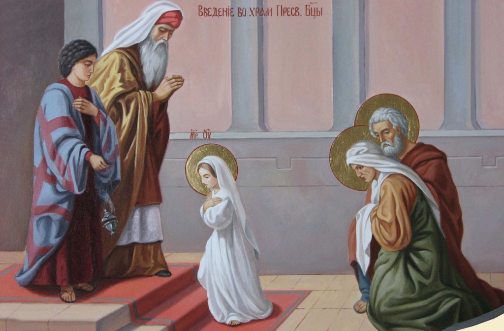 Родители Девы Марии Иоаким и Анна, молясь о разрешении неплодства, дали обет, если родится дитя, посвятить его Богу. Бог дал Иоакиму и Анне Дочь Марию.