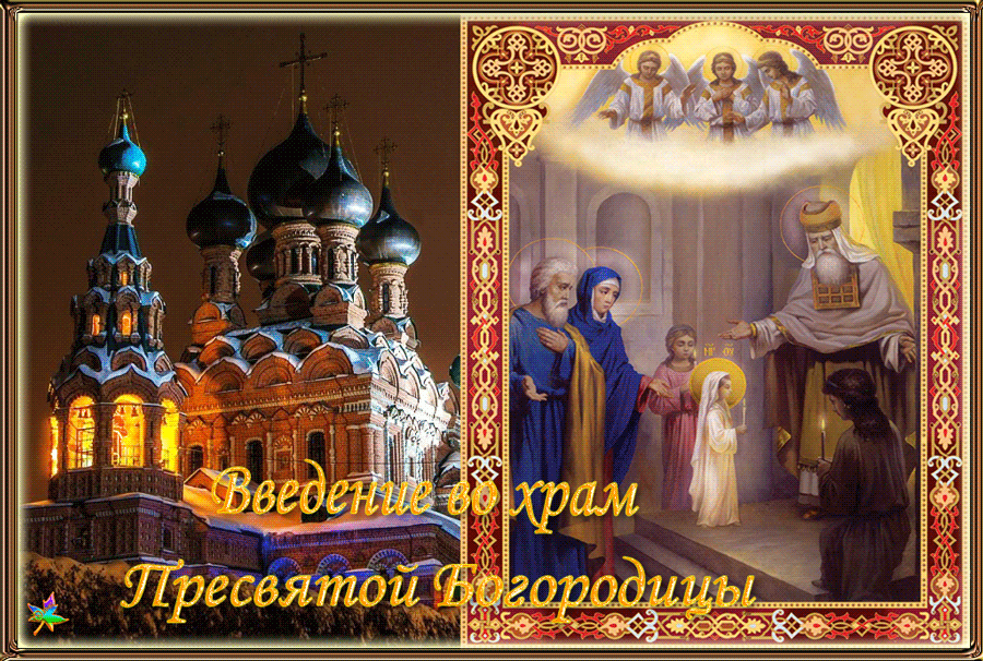 Когда Деве Марие исполнилось три года, святые родители решили исполнить своё обещание. Собрав родственников и знакомых, одев Пречистую Марию в лучшие одежды, с пением священных песен, с зажжёнными свечами в руках привели Её в Иерусалимский храм. Там встретил отроковицу первосвященник со множеством священников. В храм вела лестница в пятнадцать высоких ступеней. Младенец Мария казалось, не могла бы Сама взойти по этой лестнице. Но, как только Её поставили на первую ступень, укрепляемая Силой Божией, Она быстро преодолела остальные ступени и взошла на верхнюю. Затем первосвященник по внушению Свыше, ввёл Пресвятую Деву во Святое Святых, куда из всех людей только раз в году входил первосвященник с очистительной жертвенной кровью. Все присутствующие в храме дивились необыкновенному событию. Праведные Иаким и Анна, вручив Дитя воле Отца Небесного, возвратились домой. Преблагословеная Мария осталась в помещении для девственниц, находившимся при храме.