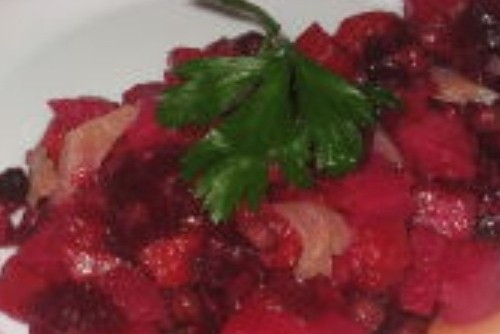 Готовые овощи достать из воды, свеклу обдать холодной водой, всё остудить, очистить и нарезать кубиками.