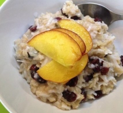 В обычную овсяную кашу на воде, под конец варки добавить кокосовую стружку, сушенную клюкву — в ней много витмина С и антиаксидантов (можно других ягод) перемешать варить в течении 30 секунд. Затем мёд и свежие фрукты, персик или другие фрукты, какие вам нравятся.