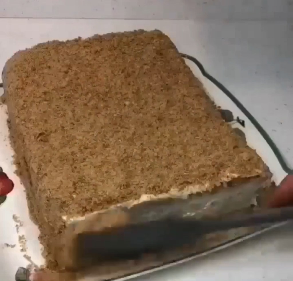 После того как коржи остынут перерезать их пополам. Края обрезать и измельчить в блендере в крошку.