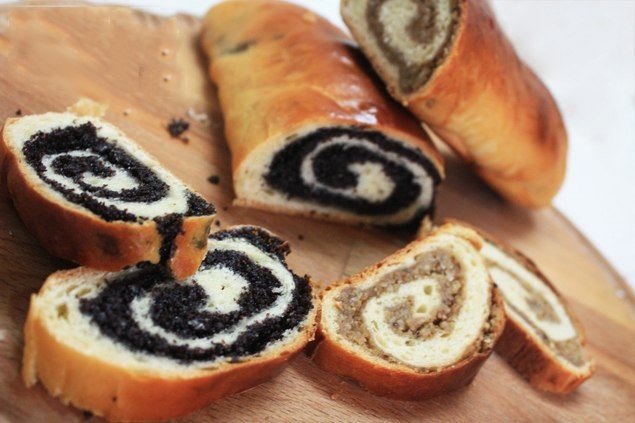 Смешать в миске 100 г тёплого молока, 0,5 столовой ложки сахара, половину стакана муки и дрожжи. Тщательно растиреть, для того, чтобы комочки муки полностью растворились ( можно смешивать миксером).Накрыть и оставить в тёплом месте на 1 час. Опара должна увеличиться вдвое. Слегка нагреть оставшиеся 100 г молока, растворить в нём масло, немного подсолить. Соединить маслянно-молочную смесь с опарой, аккуратно перемешать. Яйца взбить с сахаром. Отправить массу в тесто. Хорошо перемешать и просеять туда оставшуюся муку, перемешать. Вымесить тесто, чтобы перестало липнуть к рукам. Оставить его подниматься на 1-2 часа. Пока тесто подходит, нужно сделать начинку. Промыть мак, залить его крутым кипятком, через несколько минут воду слить, и мак вновь залить кипятком ещё на несколько минут. Воду слить, смешать мак с сахаром, и пропустить его через мясорубку.В кастрюле смешать размолотый мак, сливочное масло, молоко и мёд, и варить на медленном огне до выпаривания жидкости, примерно 40 минут. Остудить.