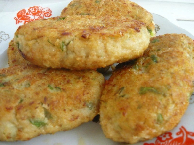 500 г рыбной икры, 1,5 средних луковицы, 2 зубчика чеснока, 5 столовых ложек вареного риса, 2 столовые ложки овсяных хлопьев, 1/4 чайной ложки соды, зелень по вкусу, соль, чёрный перец по вкусу, панированные сухари.