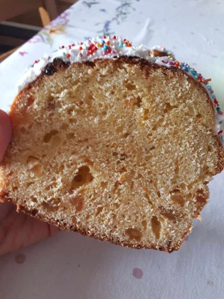 Поставить тесто на подъем на 1 час. Цукаты или изюм обвалять в муке, вмесить в тесто. Разделить на нужное количество частей. Разложить в формы на 1/2 объёма, наколоть спицей и даём расстояться 1 час.