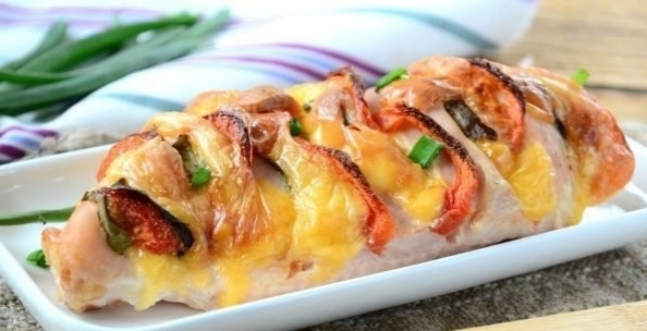 Куриную грудку промыть под проточной водой и обсушите бумажными полотенцами. По всей длине грудки сделать поперёчные надрезы, не дорезая до конца примерно 1-1,5 см. Посолить и поперчить грудку. В надрезы вложите кусочки сыра, кружочки помидора и зелень. Переложить грудку в форму для запекания. Сверху полить маслом. Запекайть грудку в духовке при температуре 180 градусов 30-40 минут.