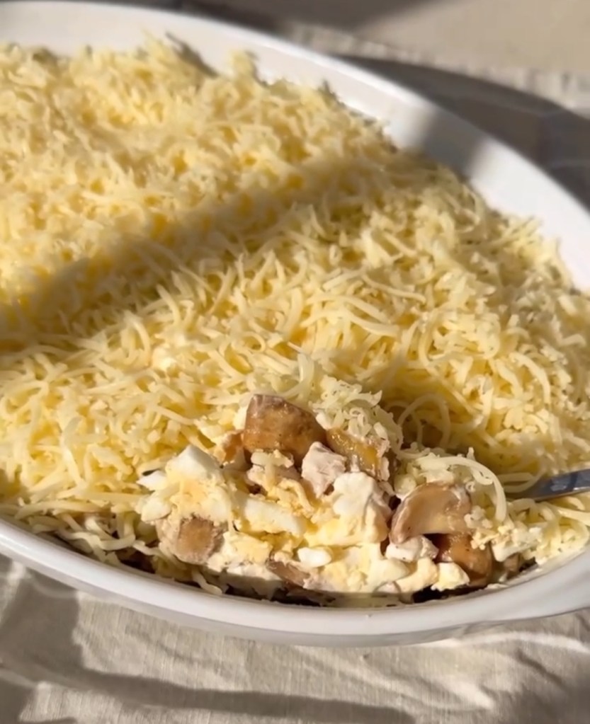 Вылаживать салат слоями: курица, майонез, грибы с луком, майонез, яйца, майонез, сыр.
