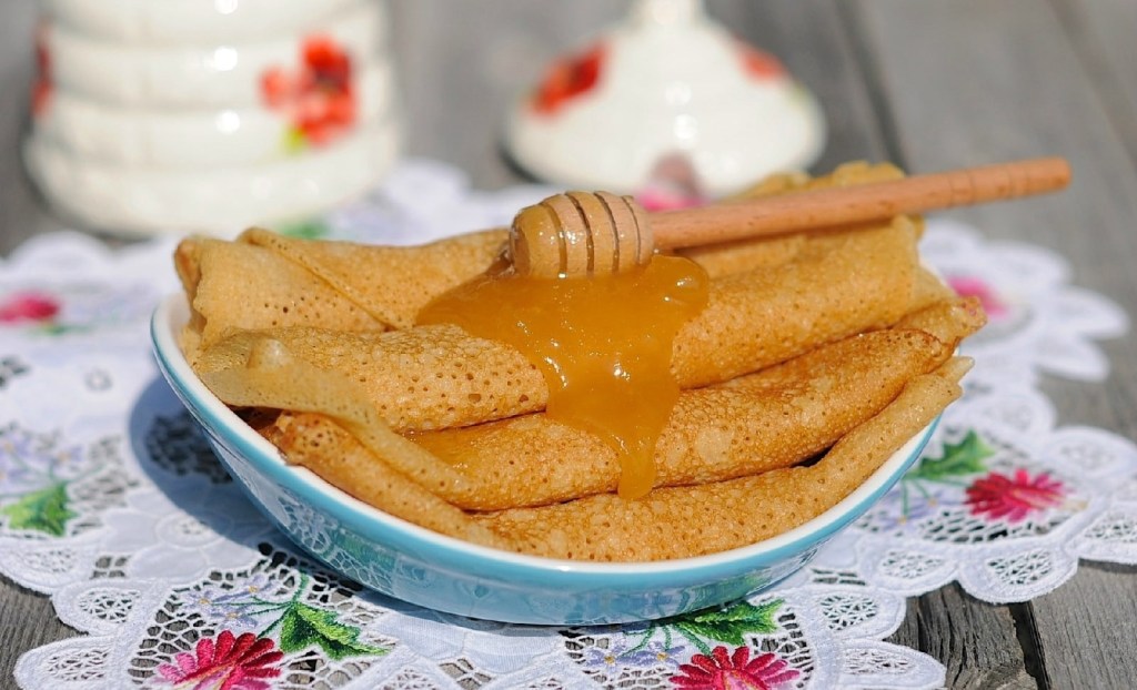 Снять готовый блин со сковороды и переложить на тарелку. Подавать с мёдом 🍯.
