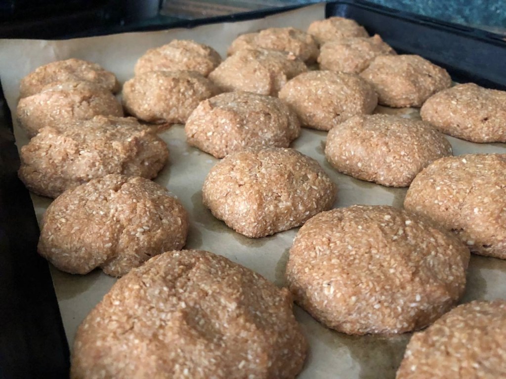 Противень застелить пергаментной бумагой для выпечки. Выложить тесто небольшими печеньками при помощи ложки.