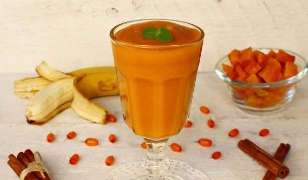 150 г мякоти тыквы (свежей или замороженной), 100 г облепихи (свежей или замороженной), 1 банан (средний), 100 мл воды, 05 чайной ложки корицы (по вкусу), 1 чайная ложка мёда (по вкусу).