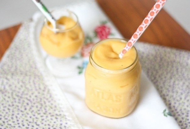 1 штука банан, 1 манго, 0,5 стакана растительного молока.