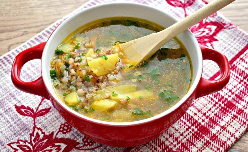 Варить гречневый суп до готовности картофеля на небольшом огне под крышкой (около 20-25 минут). В конце варки приправить зеленью.