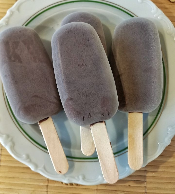 Бананы порезать кружочками и убрать в морозилку на час. Бананы положить в глубокую, удобную ёмкость, добавить холодное кокосовое молоко и пробить погружным блендером. Добавить какао (по желанию). Хорошо перемешать. Разложить по формочкам. Чтобы покрыть глазурью, дно и бока формы обмазать глазурью и поставить форму в холодильник для застывания, когда застынет, заполнить формы мороженным и верх покрыть глазурью и в морозилку для застывания.