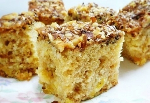 Всю эту массу необходимо хорошо перемешать и выложить на противень, предварительно застелив его кондитерской бумагой, пропитанной растительным маслом. Готовится пирог в течение 40 минут. Готовность проверить деревянной иглой.