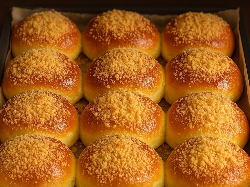 Для посыпки смешать муку, сахар и растопленное сливочное масло. Посыпать булочки сверху.