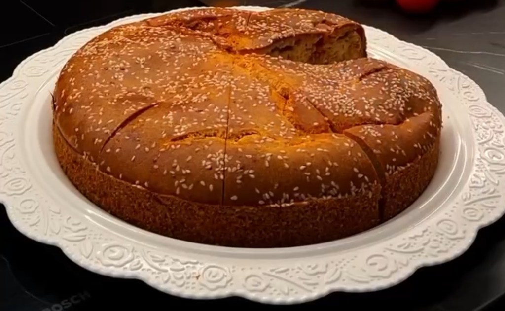 400 мл тёплого кефира, 6 яиц, 400 г муки, 1 чайная ложка соды, 1 чайная ложка соли, 8 столовых ложек растительного масла. Кунжут для посыпки.