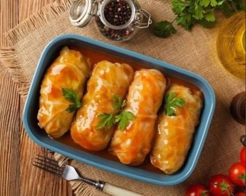 Распрямить капустные листы, выложить начинку и свернуть голубцы. Заготовки выложить в форму для запекания. Развести в 0,5 литра воды 2 столовые ложки томатной пасты. Посолить и поперчить. Залить томатной смесью голубцы.