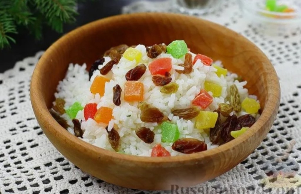 Рис выложить в миску добавить воду, сахар, изюм и цукаты. Воды добавлять на своё усмотрение.