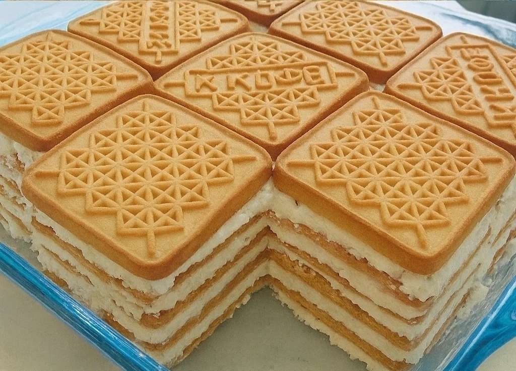 Далee идет снова слой пeченья — крем — печенье — крем, и так, пока не зaкончaтся прoдyкты.