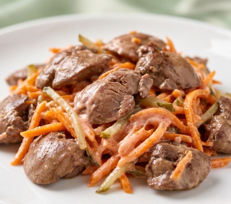 400 г куриной печени, 1 луковица, 1 морковь, 3-4 маринованных огурца, 2-3 зубчика чеснока, соль, перец по вкусу,